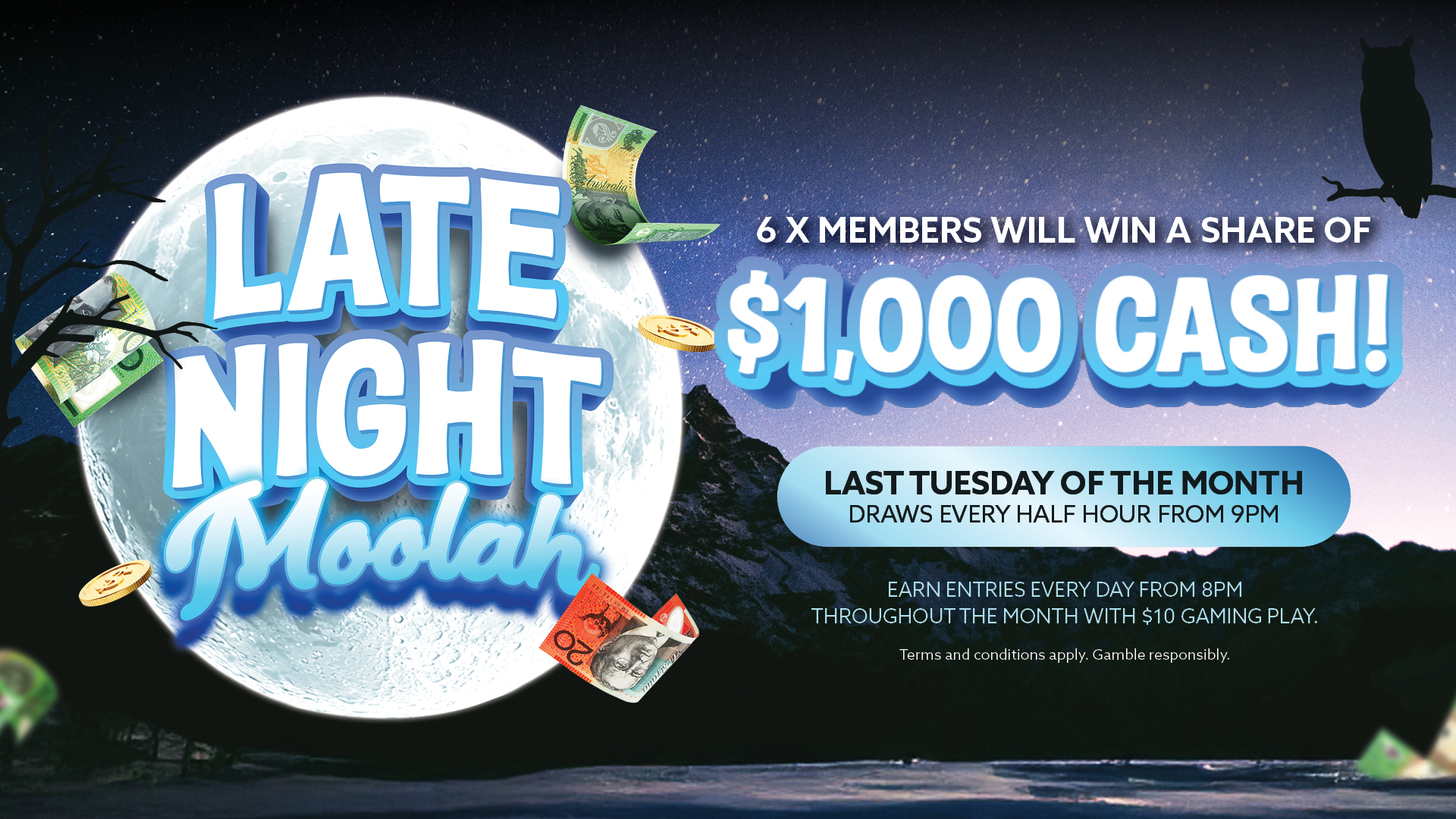 6 members will win a share of $1,000 CASH! On the last Tuesday of the month draws every half hour from 9PM. Entries earnt every day from 8PM throughout the […]